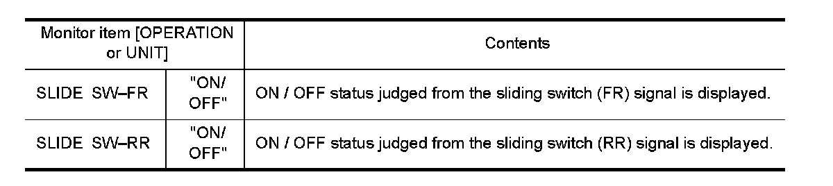 With "SLIDE SW-FR, SLIDE SW-RR" on the DATA MONITOR, operate the sliding switch to check ON/OFF operation.