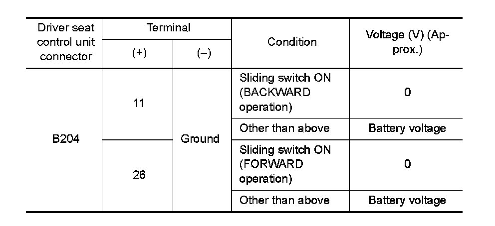 2. Check voltage between driver seat control unit connector and ground.