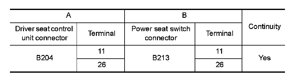 2. Check continuity between driver seat control unit connector and power seat switch connector.