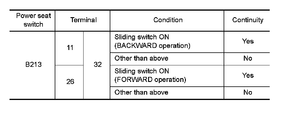 Check continuity between power seat switch terminals.