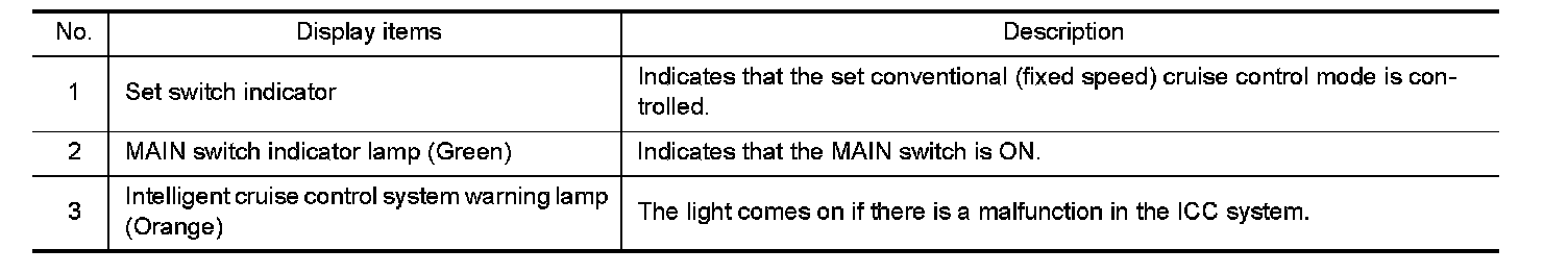 The status of ICC system is displayed by dot matrix LCD, MAIN switch indicator lamp and ICC system warning lamp on the combination meter.