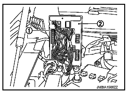 3. Disconnect fuel pump fuse (1) from IPDM E/R (2) to avoid fuel injection during measurement.