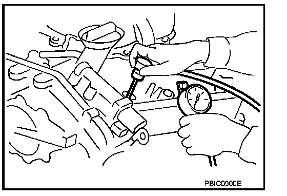 8. With accelerator pedal fully depressed, turn ignition switch to "START" for cranking. When the gauge pointer stabilizes, read the compression pressure and engine rpm. Perform these steps to check each cylinder.