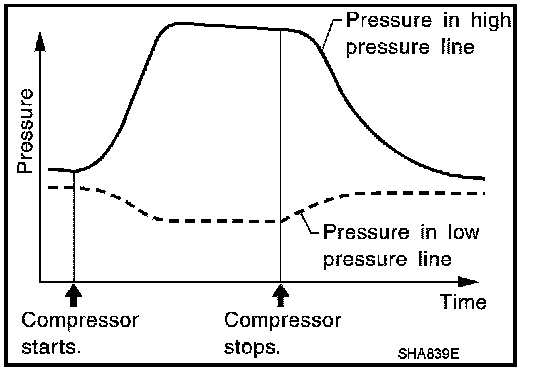 The pressure on the high-pressure side drops gradually after refrigerant circulation stops and pressure on the low-pressure side rises gradually, as shown in the graph. Some leakages are more easily detected when pressure is high.
