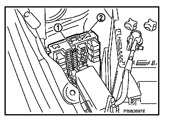 3. Remove fuel pump fuse (1) in IPDM E/R (2) to release fuel pressure.