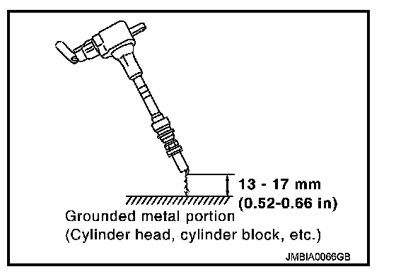 11. Fix ignition coil using a rope etc. with gap of 13 - 17 mm (0.52 -0.66 in) between the edge of the spark plug and grounded metal portion as shown in the figure.