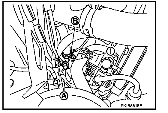 6. Remove alternator mounting bolt (A) and alternator stay mounting bolt (B) using power tools, then remove alternator stay (1).