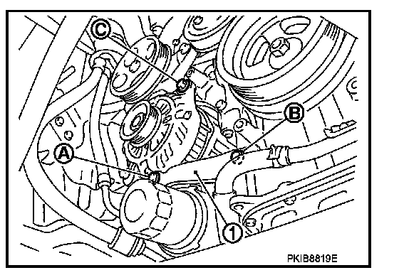 7. Remove alternator mounting bolt (C), using power tools.