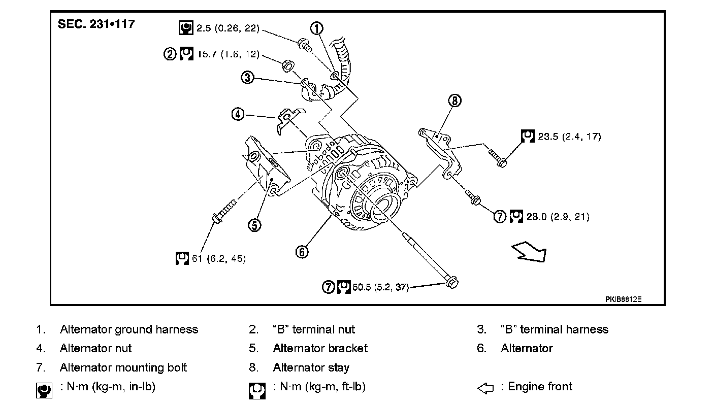 Alternator pulley nut : 118 N�m (12.0 kg-m, 87 ft-lb)