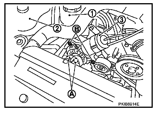 11. Remove alternator mounting bolts (B), using power tools.