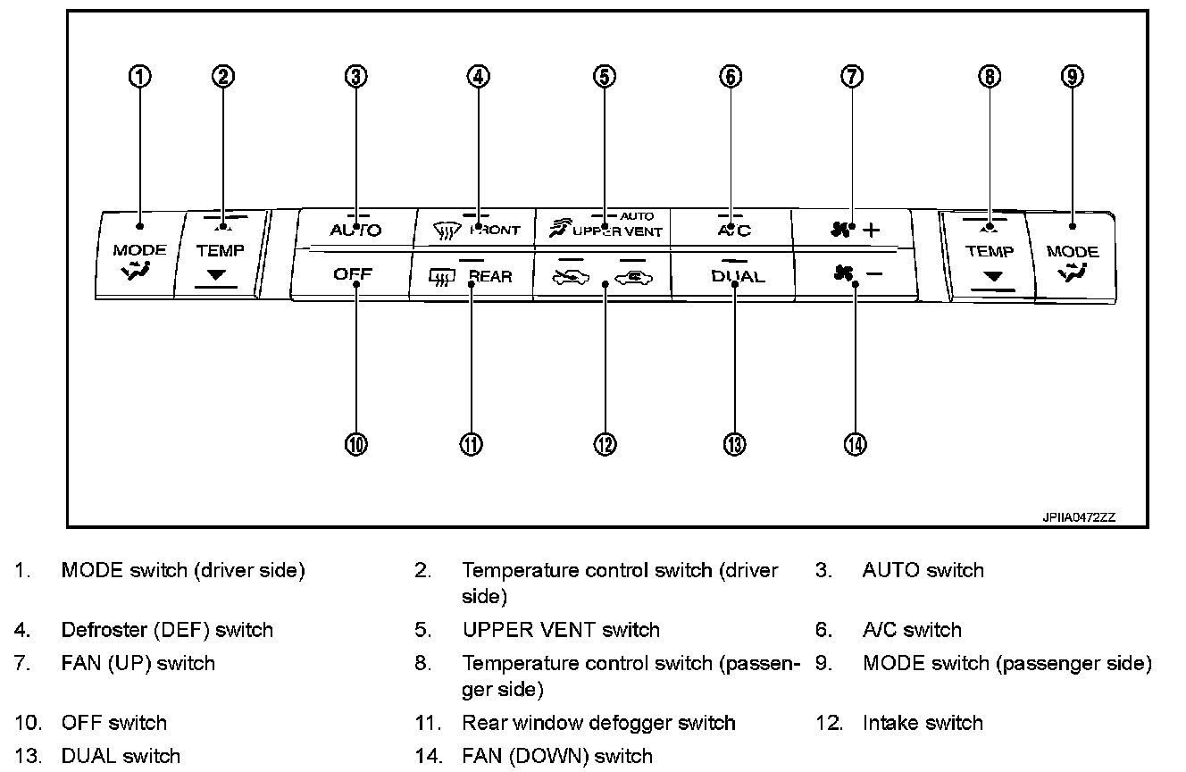 - When UPPER VENT switch is ON, UPPER VENT switch indicator lamp turns ON, and upper ventilator door is automatically controlled.