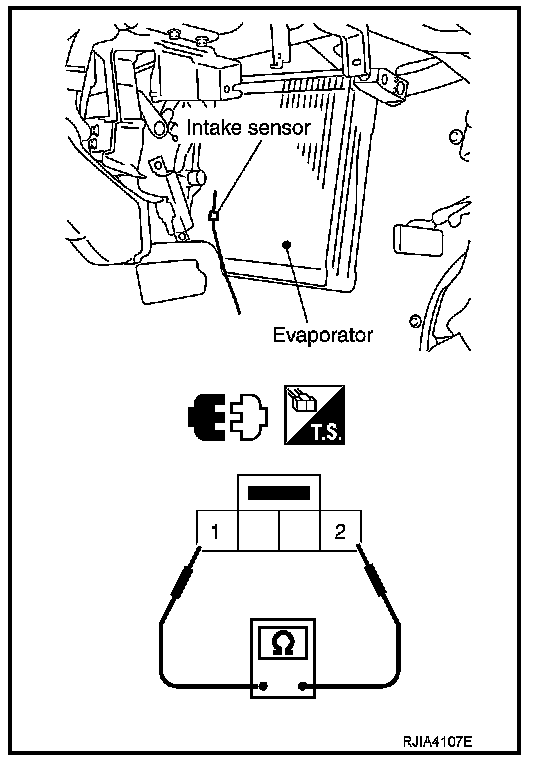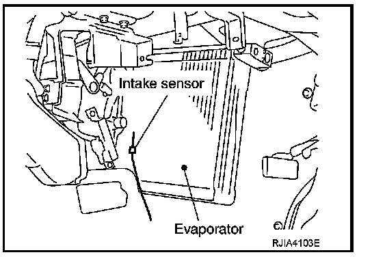 The intake sensor is located on the evaporator assembly. It converts temperature of air after it passes through the evaporator into a resistance value which is then input to the unified meter and A/C amp.