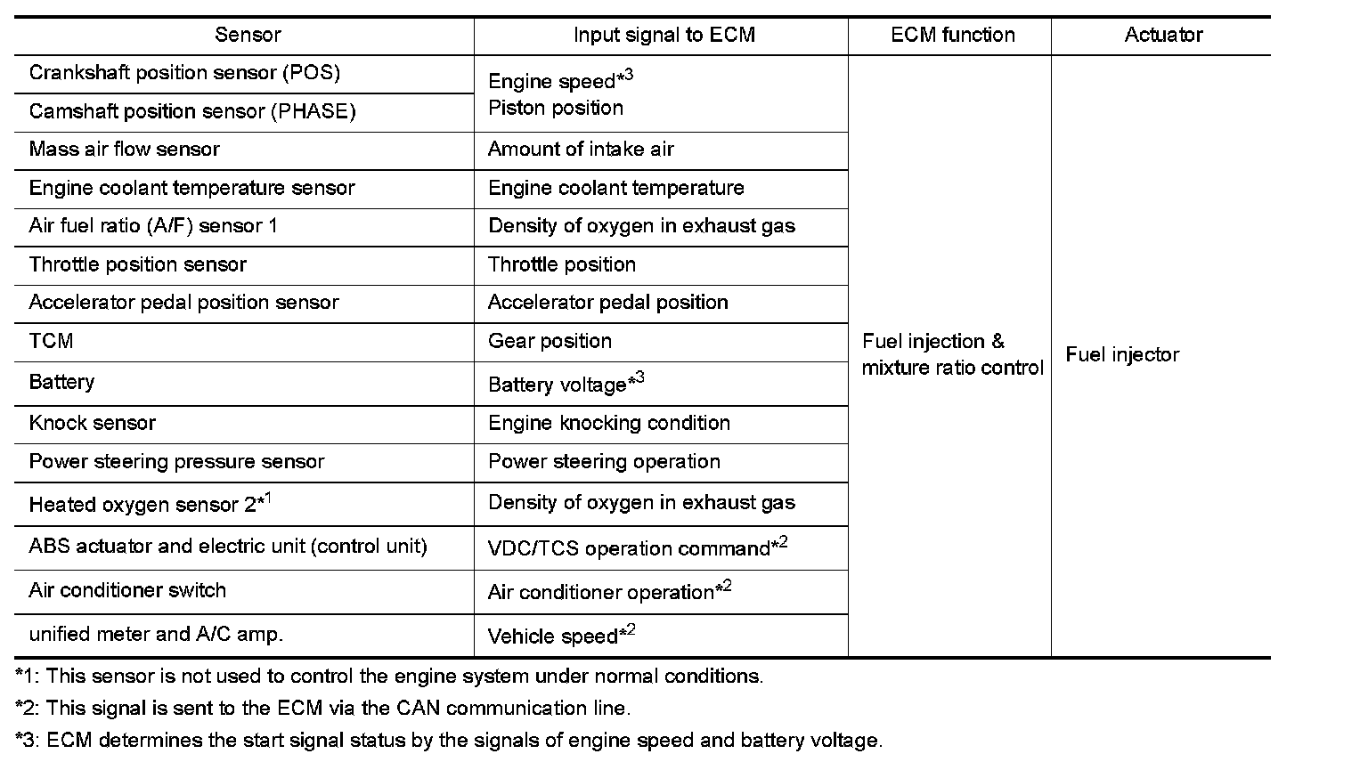 The amount of fuel injected from the fuel injector is determined by the ECM. The ECM controls the length of time the valve remains open (injection pulse duration). The amount of fuel injected is a program value in the ECM memory. The program value is preset by engine operating conditions. These conditions are determined by input signals (for engine speed and intake air) from the crankshaft position sensor (POS), camshaft position sensor (PHASE) and the mass air flow sensor.