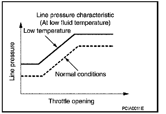 When the A/T fluid temperature drops below the prescribed temperature, in order to speed up the action of each friction element, the line pressure is set higher than the normal line pressure characteristic.