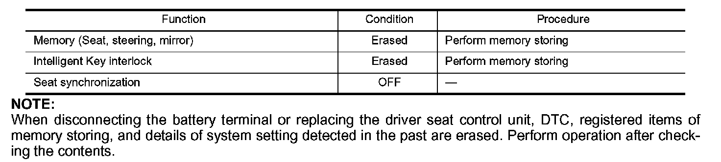Each function is reset to the following condition when the driver seat control unit is replaced.