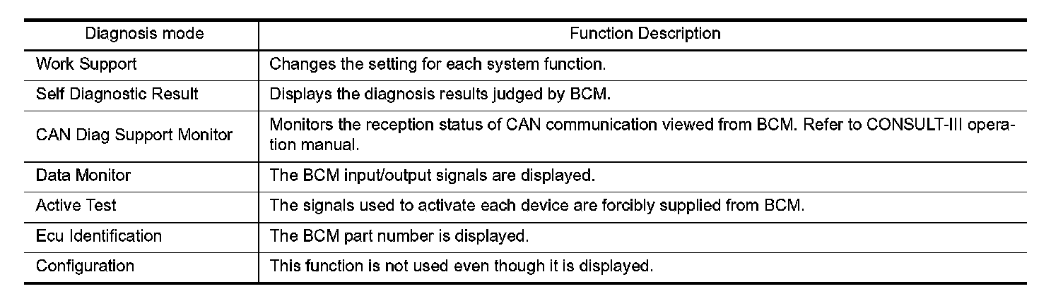 CONSULT-III performs the following functions via CAN communication with BCM.