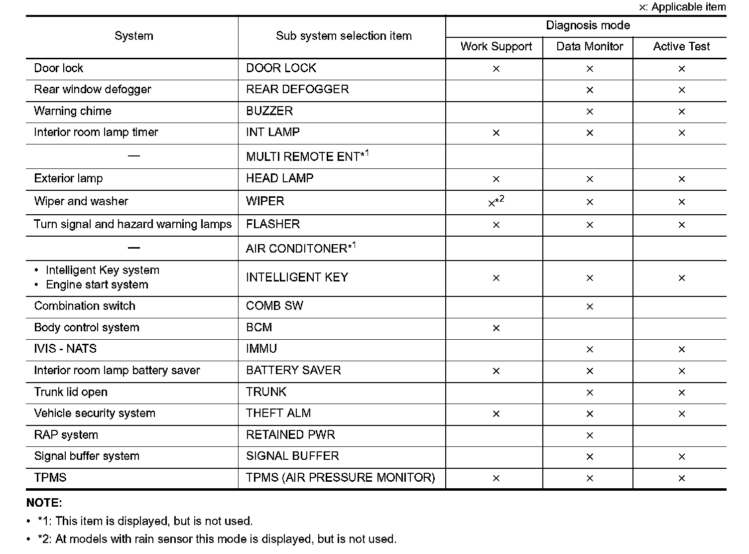 It can perform the diagnosis modes except the following for all sub system selection items.