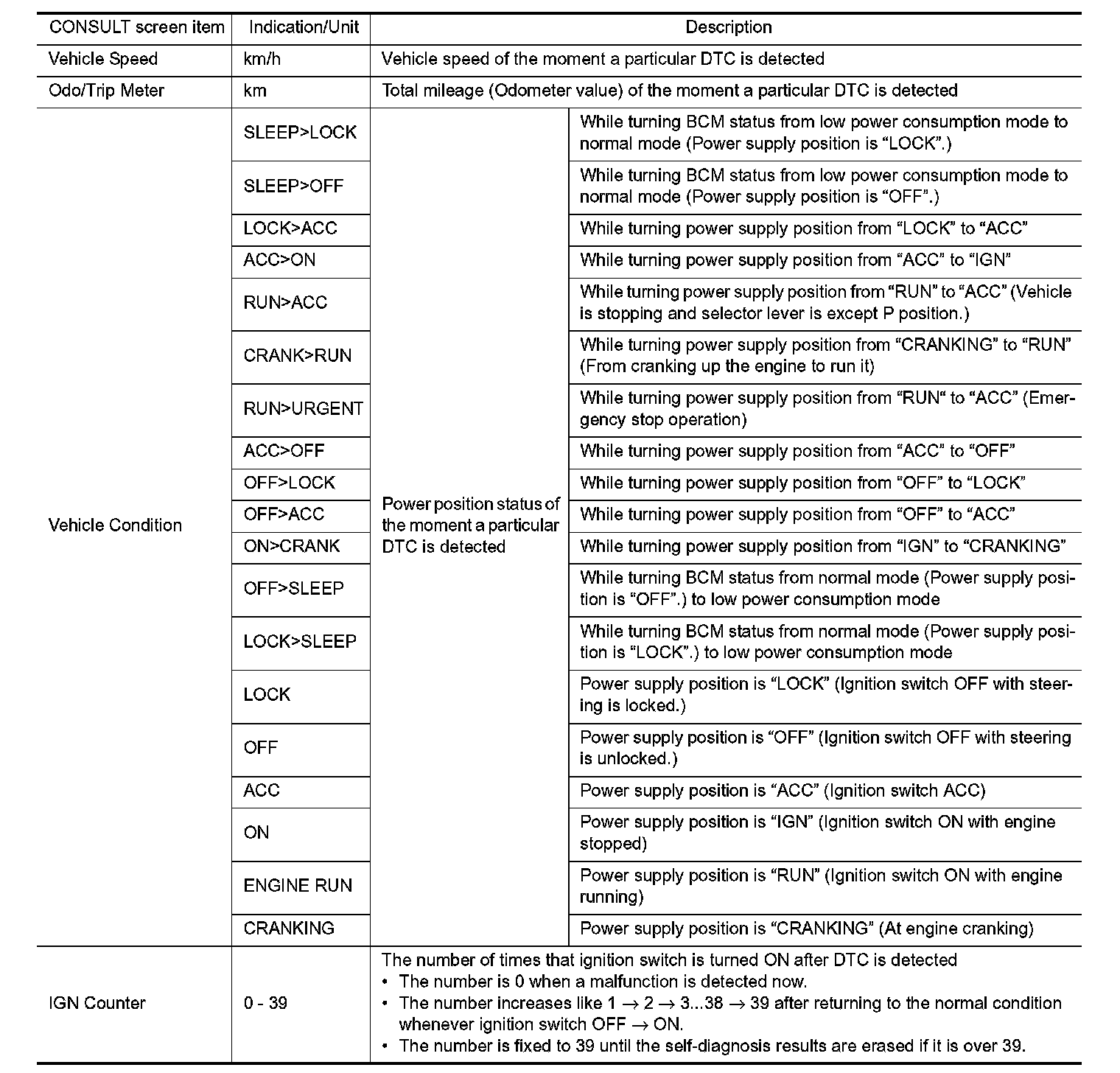 The BCM records the following vehicle condition at the time a particular DTC is detected, and displays on