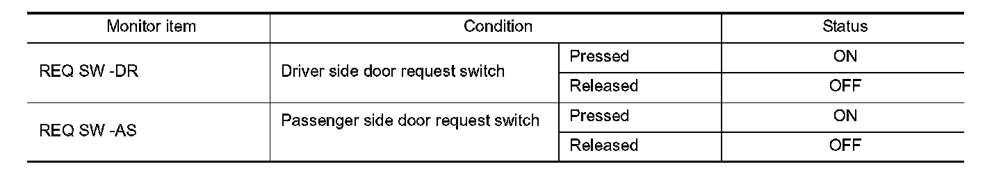 Check ("REQ SW -DR" or "REQ SW -AS") in BCM "Data Monitor" mode using CONSULT-III.