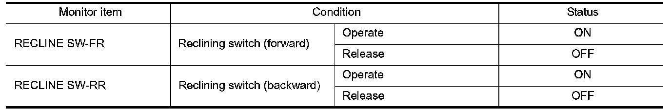3. Check reclining switch signal under the following conditions.
