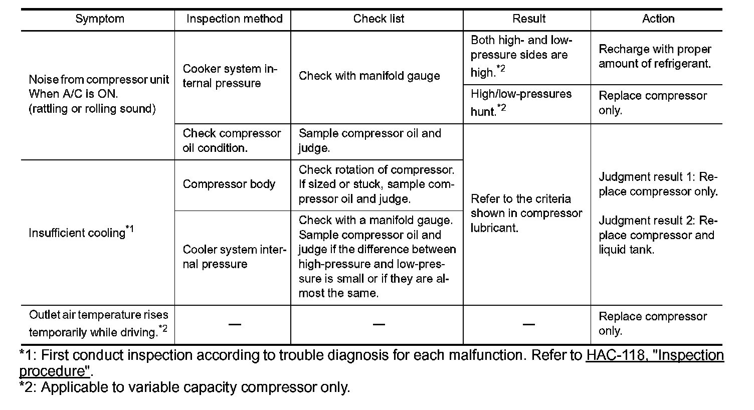 Follow the next table and perform trouble diagnosis if there is a compressor unit malfunction (internal noise, insufficient cooling).
