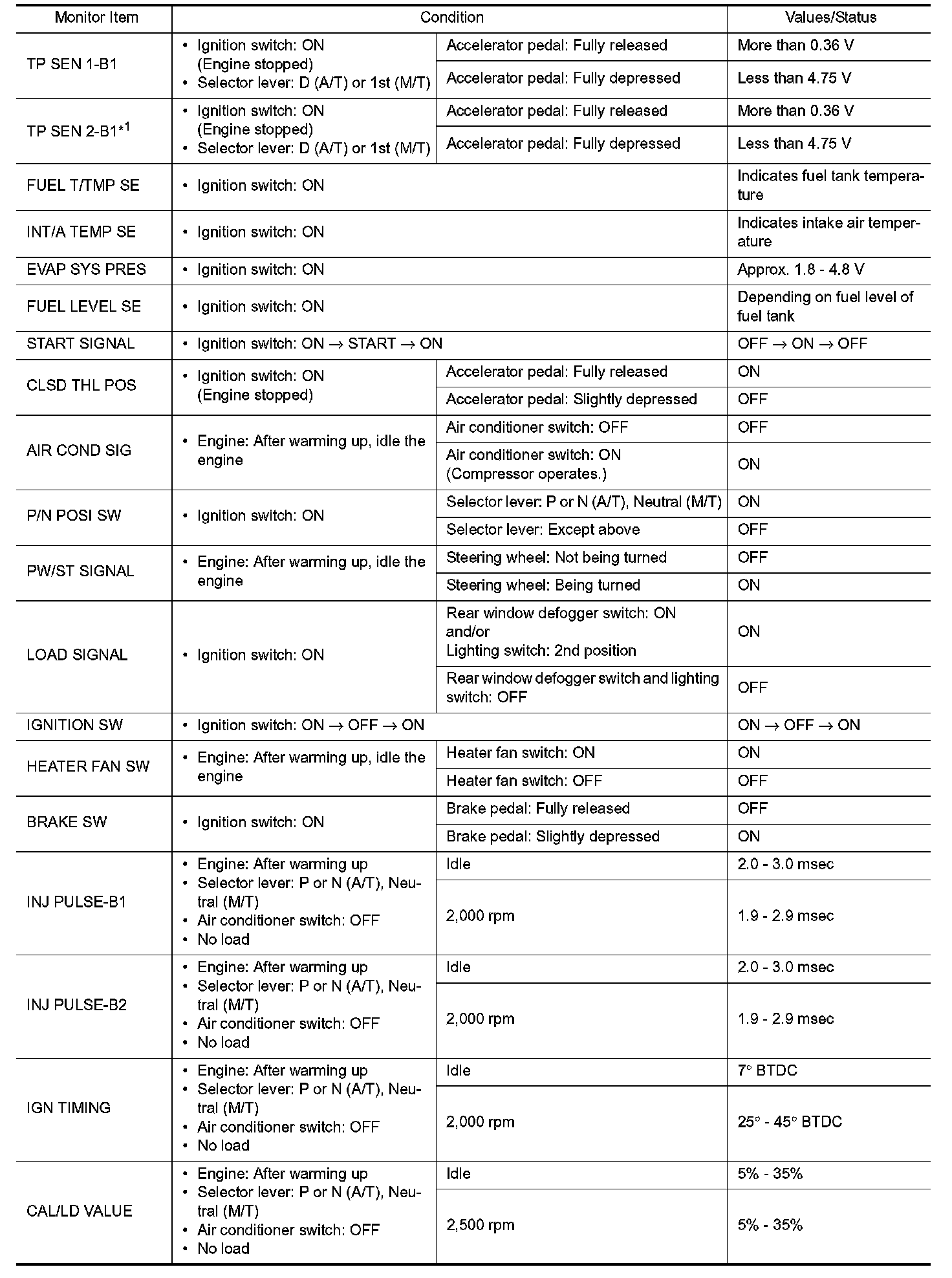 i. e. Adjust ignition timing with a timing light before monitoring IGN TIMING, because the monitor may show the specification data in spite of the ignition timing not being adjusted to the specification data. This IGN TIMING monitors the data calculated by the ECM according to the signals input from the camshaft position sensor and other ignition timing related sensors.
