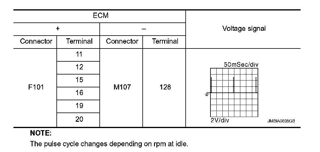 2. Read the voltage signal between ECM harness connector terminals under the following conditions with an oscilloscope.