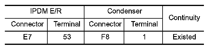 3. Check the continuity between IPDM E/R harness connector and condenser harness connector.