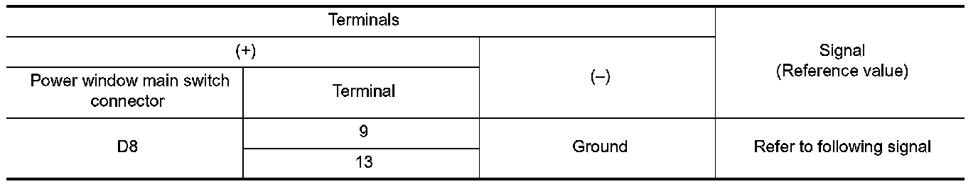 2. Check signal between power window main switch harness connector and ground with oscilloscope.