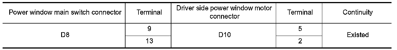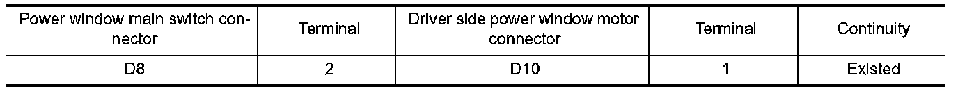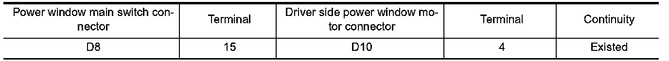 2. Check continuity between power window main switch harness connector and driver side power window motor harness connector.