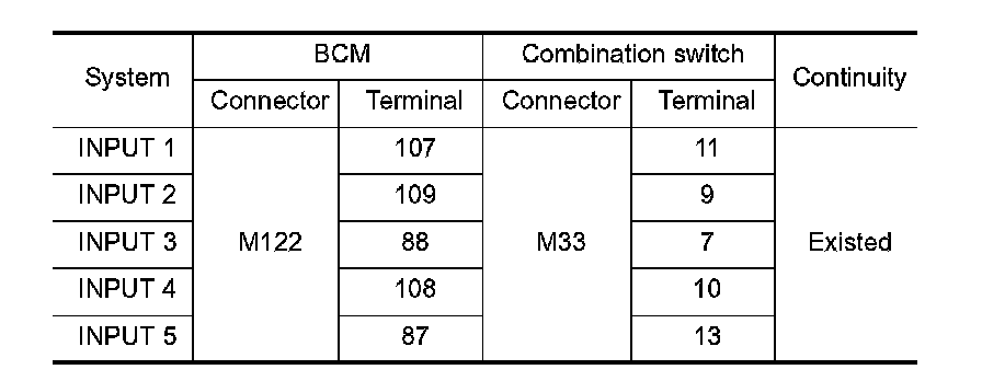 3. Check continuity between BCM harness connector and combination switch harness connector.