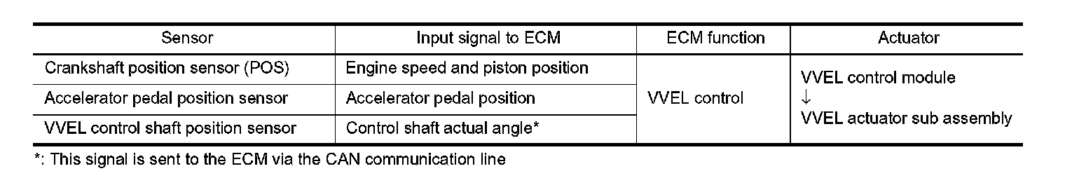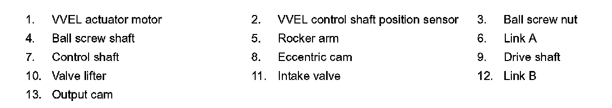 VVEL (Variable Valve Event & Lift) is a system that controls valve event and valve lift continuously. Rotational movement of the drive shaft equipped with eccentric cam is transmitted to output cam via the rocker arm and two kinds of links to depress the intake valve. ECM decides the target valve lift according to the driving condition and sends the command signal to the VVEL control module. The VVEL control module controls the rotation of the control shaft using the VVEL actuator motor and changes the movement of the output cam by shifting the link supporting point. As a result, valve lift changes continuously to improve engine output and response.