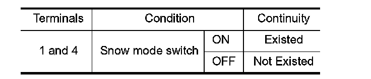 3. Check the continuity between snow mode switch terminals under the following conditions.