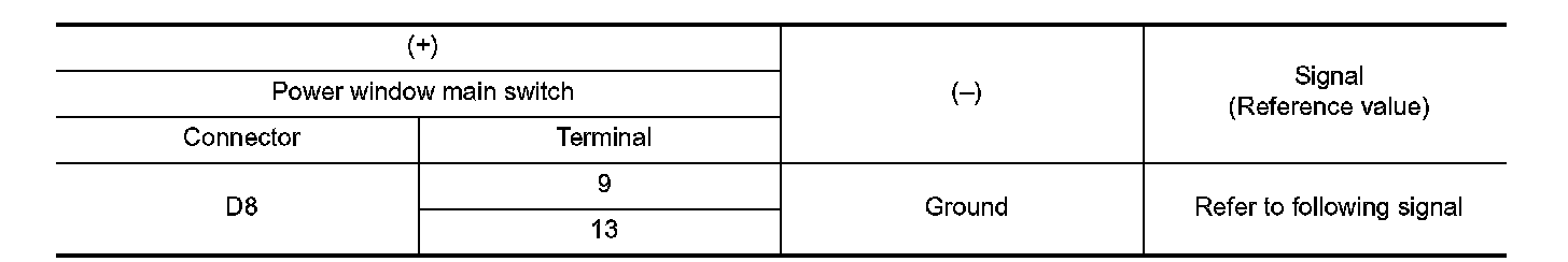 2. Check signal between power window main switch harness connector and ground using oscilloscope.