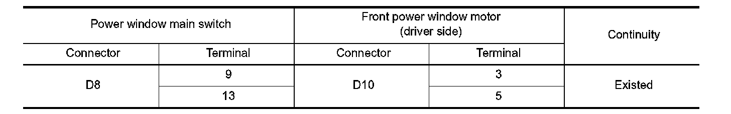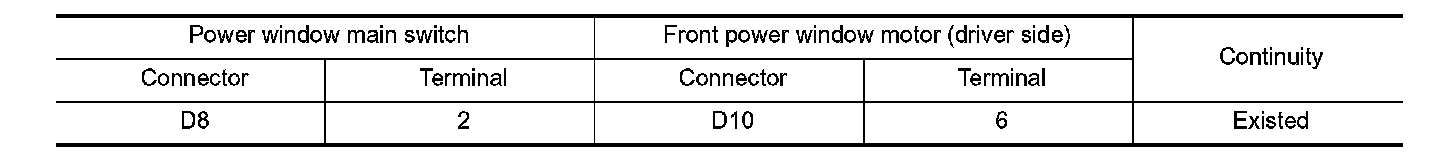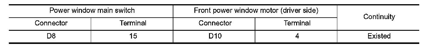 3. Check continuity between power window main switch harness connector and front power window motor
