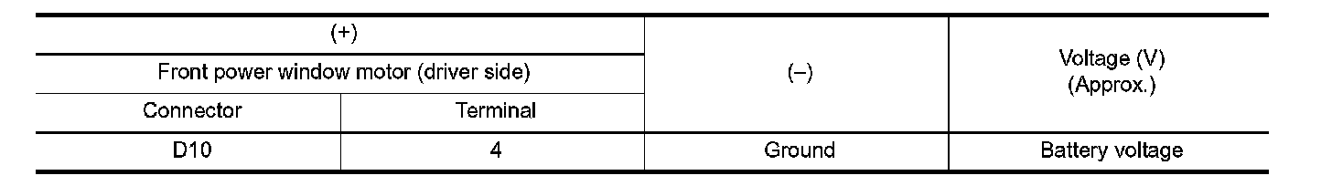 3. Check voltage between front power window motor (driver side) harness connector and ground.