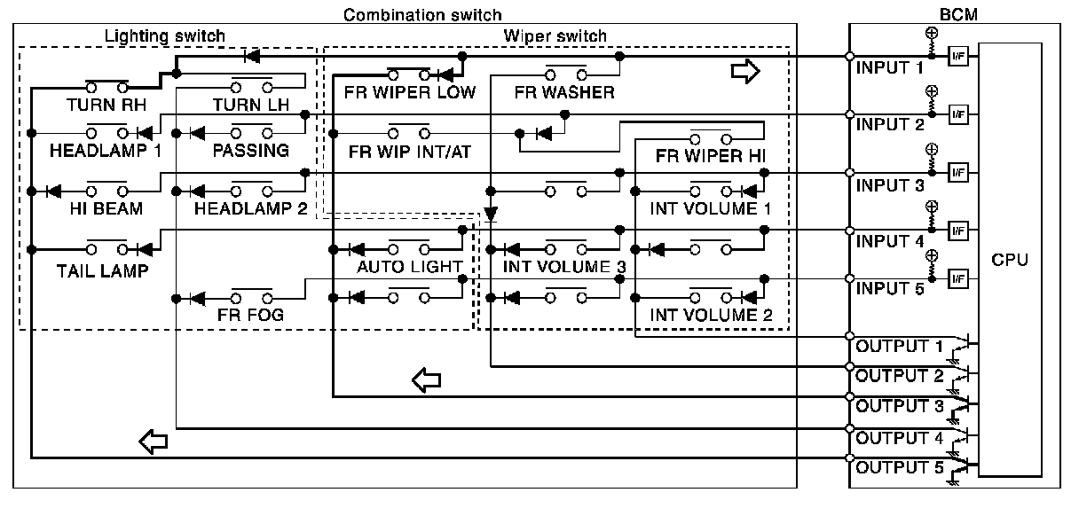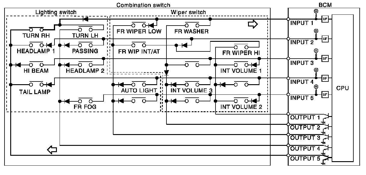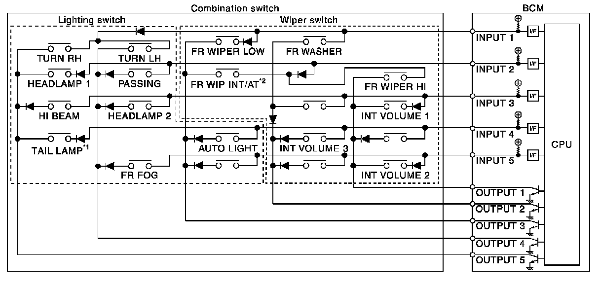 - BCM detects the combination switch status signal "1CE" when the signals of OUTPUT 3 and OUTPUT 5 are input to INPUT 1.