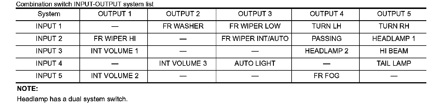 - BCM detects the combination switch status signal "1E" when the signal of OUTPUT 5 is input to INPUT 1.