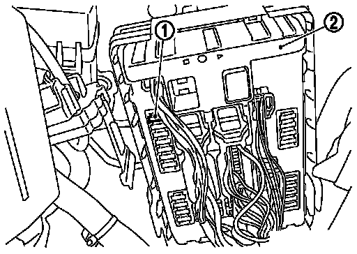 3. Disconnect fuel pump fuse (1) from IPDM E/R (2) to avoid fuel injection during measurement.
