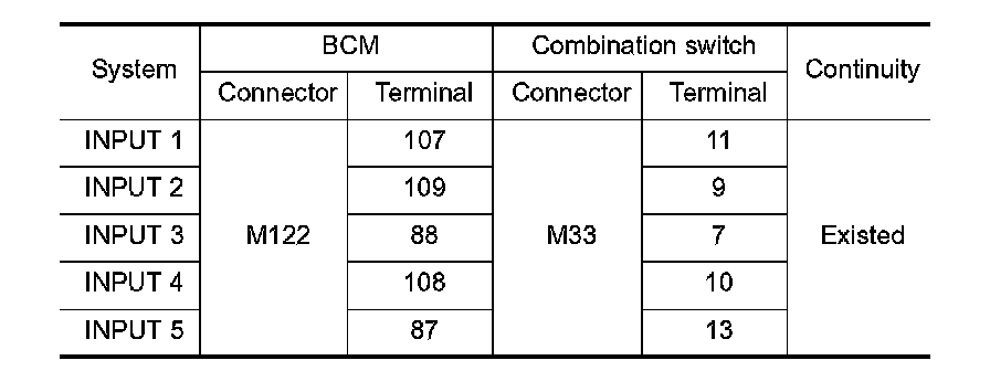 3. Check continuity between BCM harness connector and combination switch harness connector.