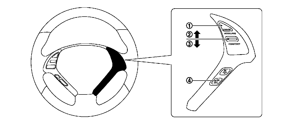 When the system is under a standby state and the vehicle speed is between approximately 40 to 144 km/h (25 to 90 MPH), pushing the SET/COAST switch will start system control.