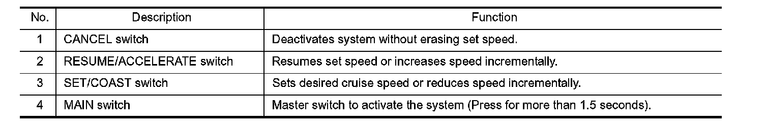 If the system is cancelled by conditions 1-7 below, the system will resume control at the last set cruising speed by pushing the RESUME/ACCELERATE switch.
