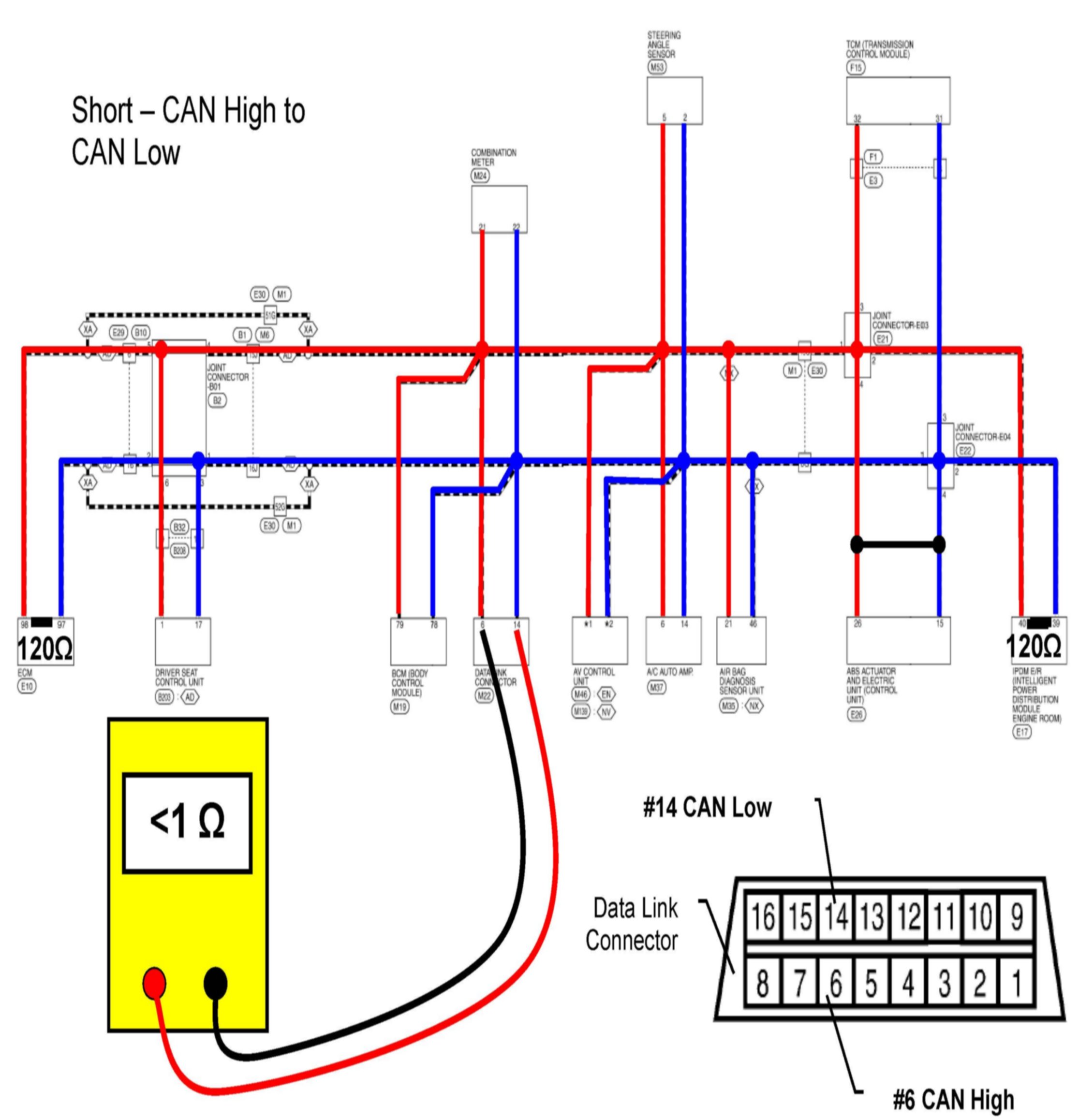 ^ Always confirm the power, ground, and CAN resistance at a suspect module before replacing the module. Resistance should be close to 60 ohms at the module (measured with the battery disconnected). The resistance at terminating modules should be close to 120 ohms. Examples of terminating modules include IPDM, ECM, or BCM. Reference the appropriate ESM to determine the terminating modules.