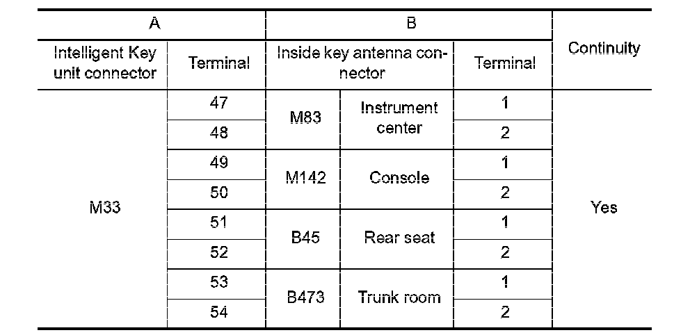 2. Check continuity between Intelligent Key unit connector and inside key antenna connector.