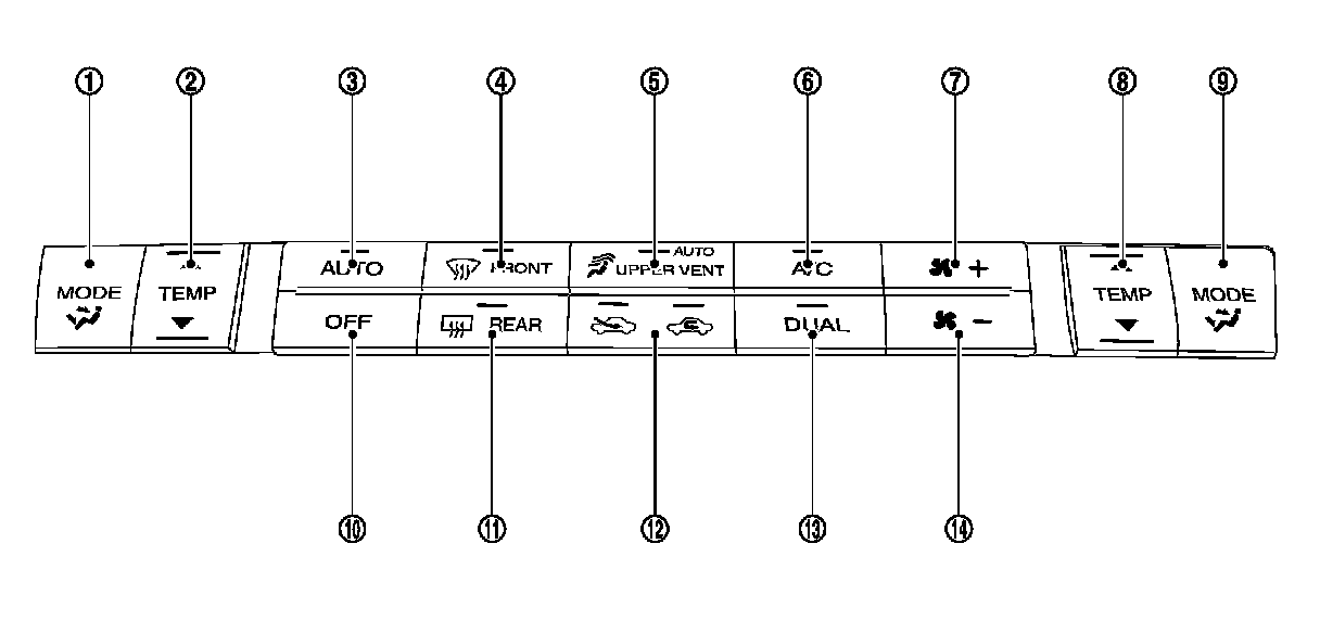 - When UPPER VENT switch is ON, UPPER VENT switch indicator lamp turns ON, and upper ventilator door is automatically controlled.