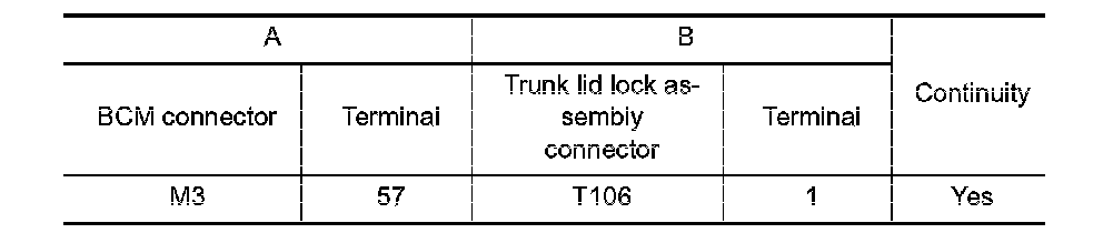 2. Check continuity between BCM connector and trunk lid lock assembly connector.