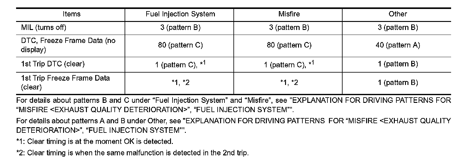 - The DTC and the freeze frame data will be stored until the vehicle is driven 40 times (driving pattern A) without the same malfunction recurring (except for Misfire and Fuel Injection System). For Misfire and Fuel Injection System, the DTC and freeze frame data will be stored until the vehicle is driven 80 times (driving pattern
