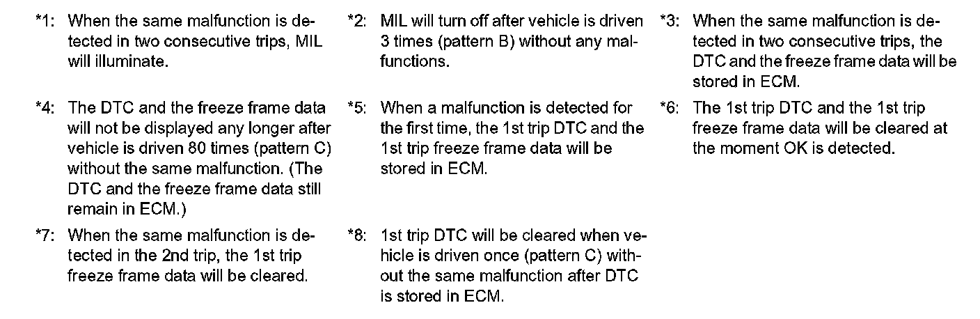 - When the same malfunction is detected in two consecutive trips, the DTC and the freeze frame data are stored in the ECM memory, and the MIL will illuminate. For details, Two Trip Detection Logic.
