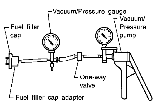 Positive pressure is delivered to the EVAP system through the EVAP service port. If fuel vapor leakage in the EVAP system occurs, use a leak detector to locate the leakage.