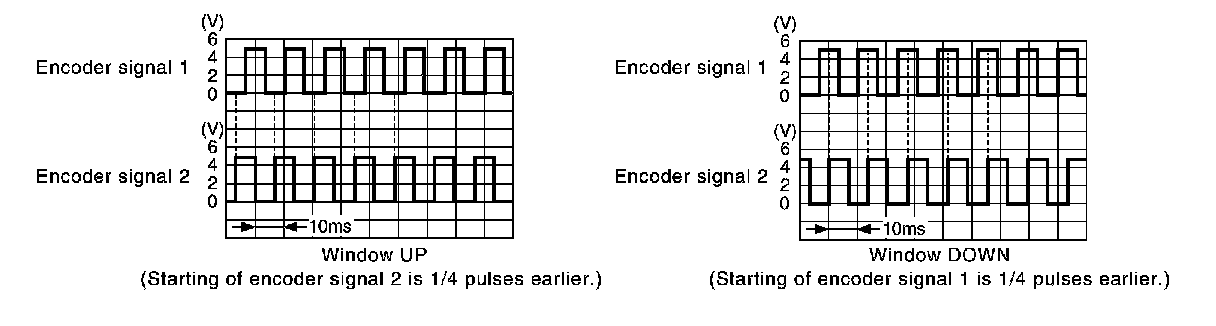 Power window main switch and each power window sub-switch recognizes and controls the door glass condition by reading encoder signals 1 and 2.